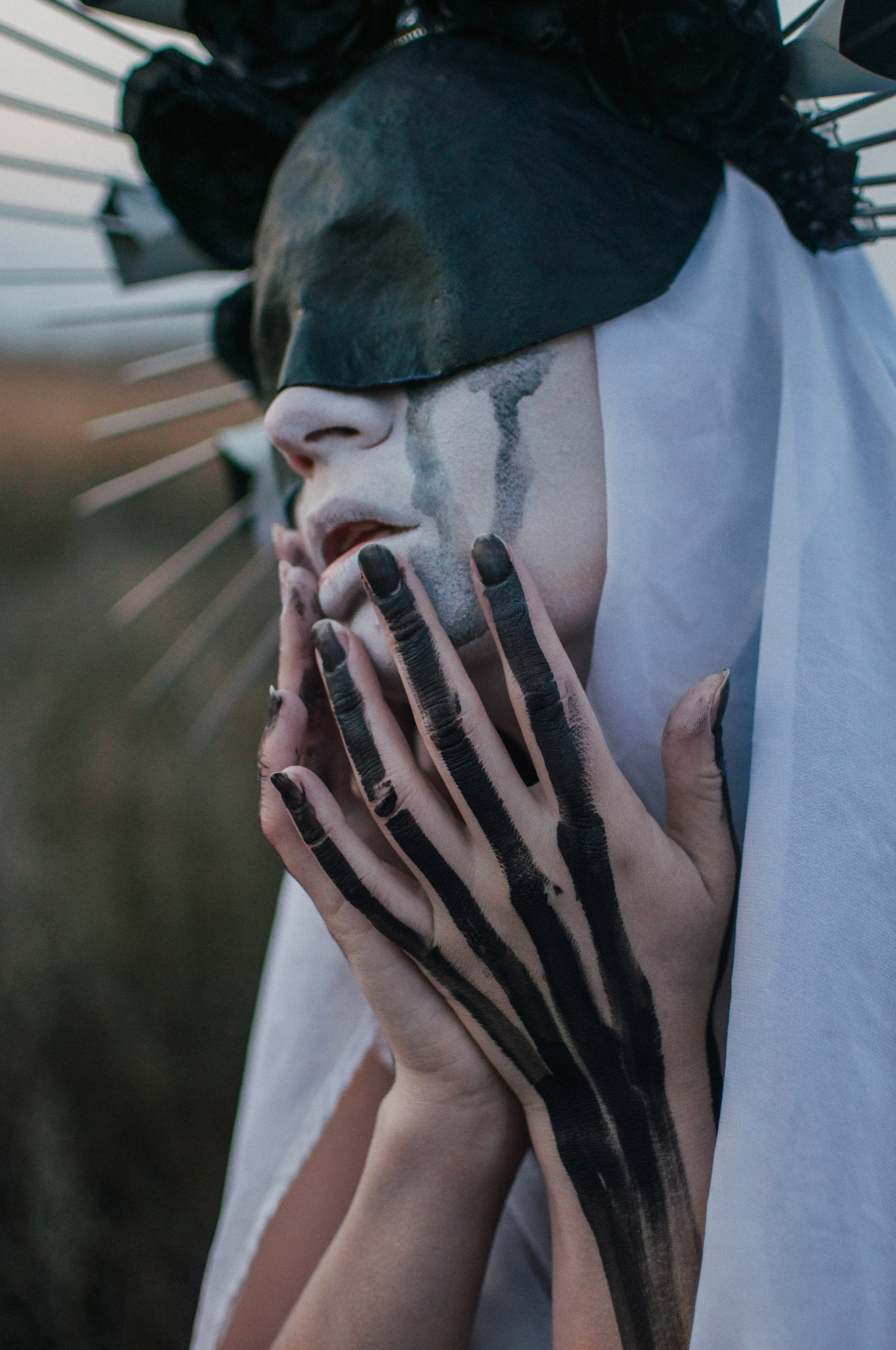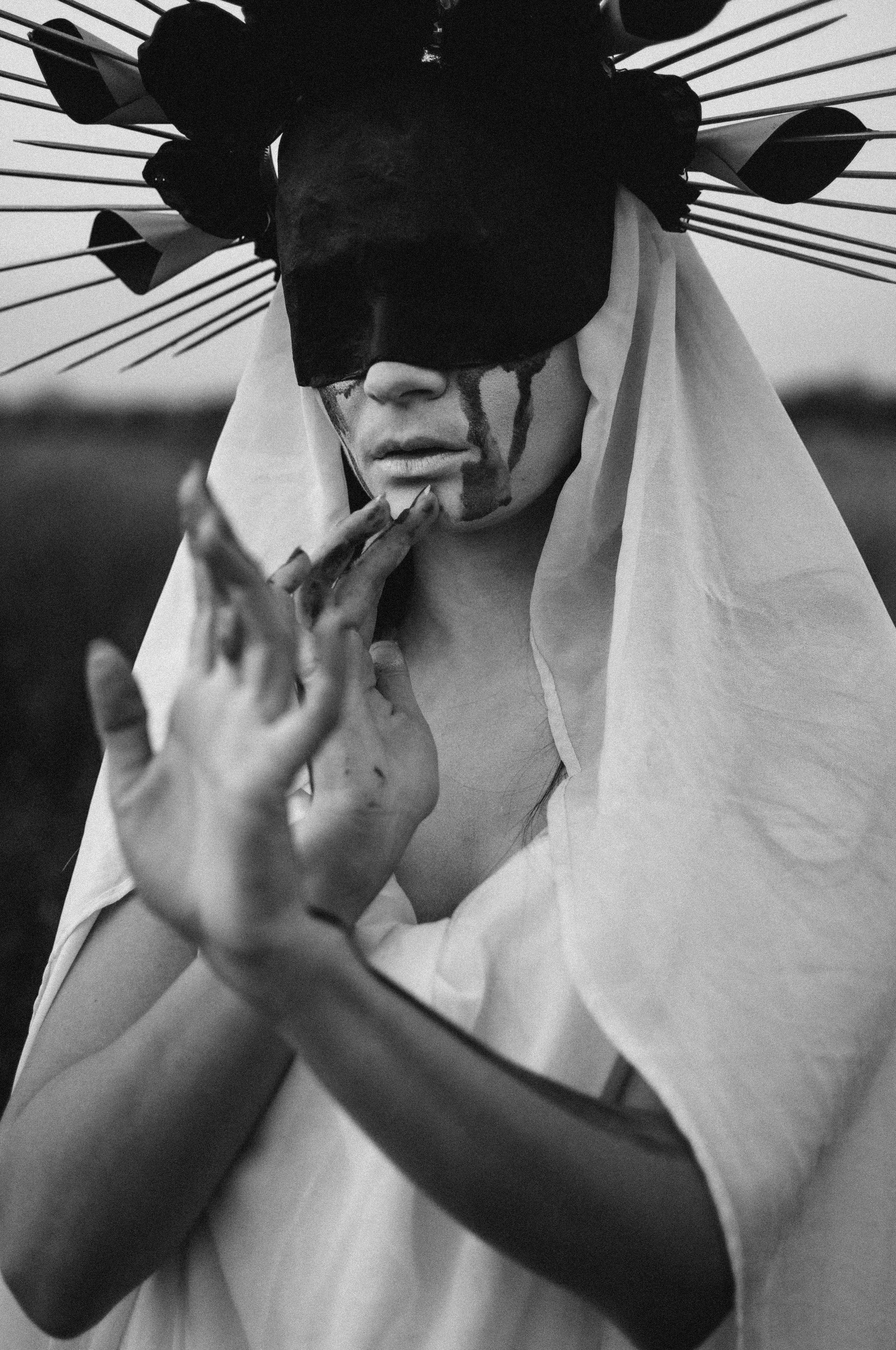 Белое платье становится саваном, символом хрупкости и памяти, а тёмная маска скрывает глаза, превращая героиню в безмолвного свидетеля своих же слёз.