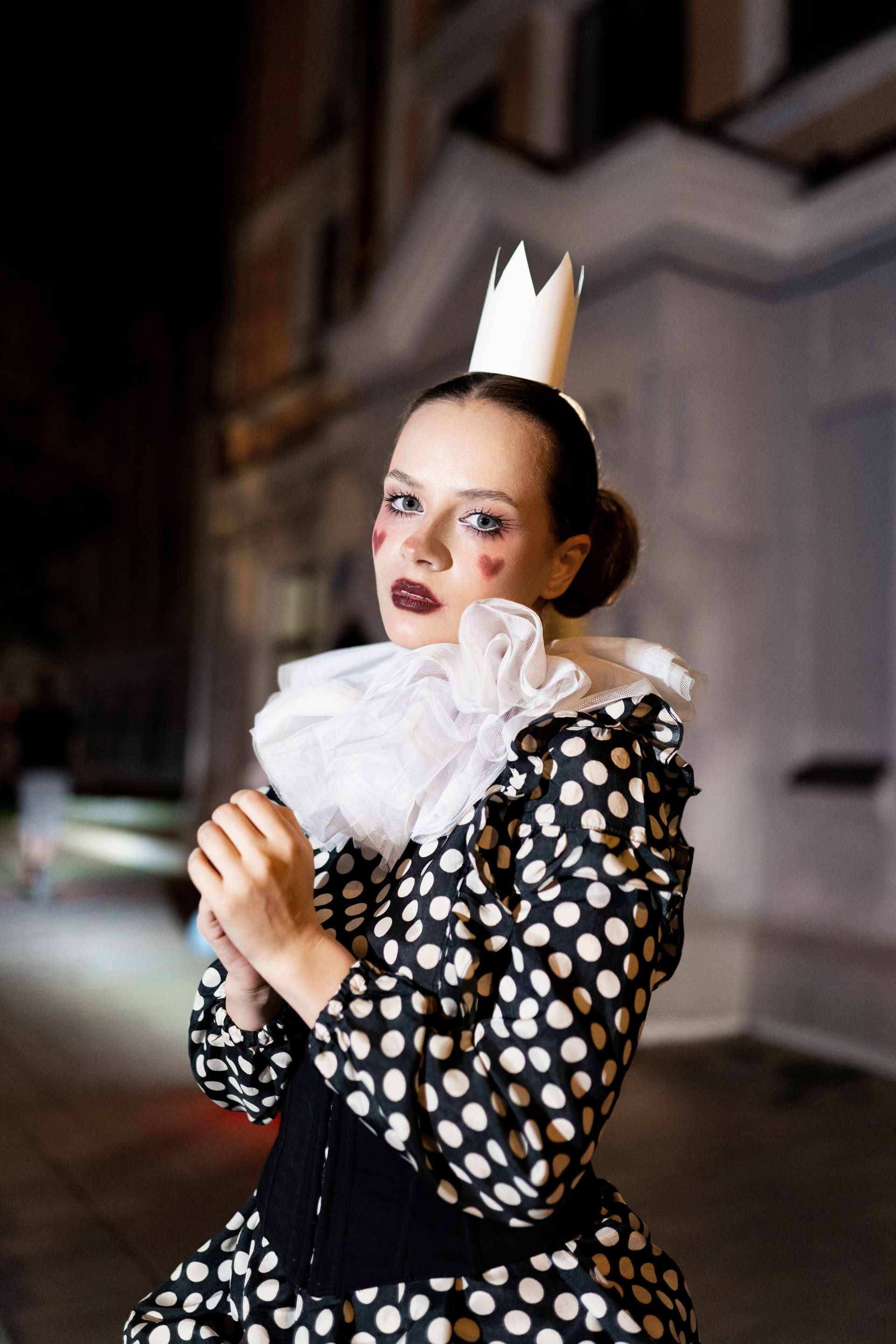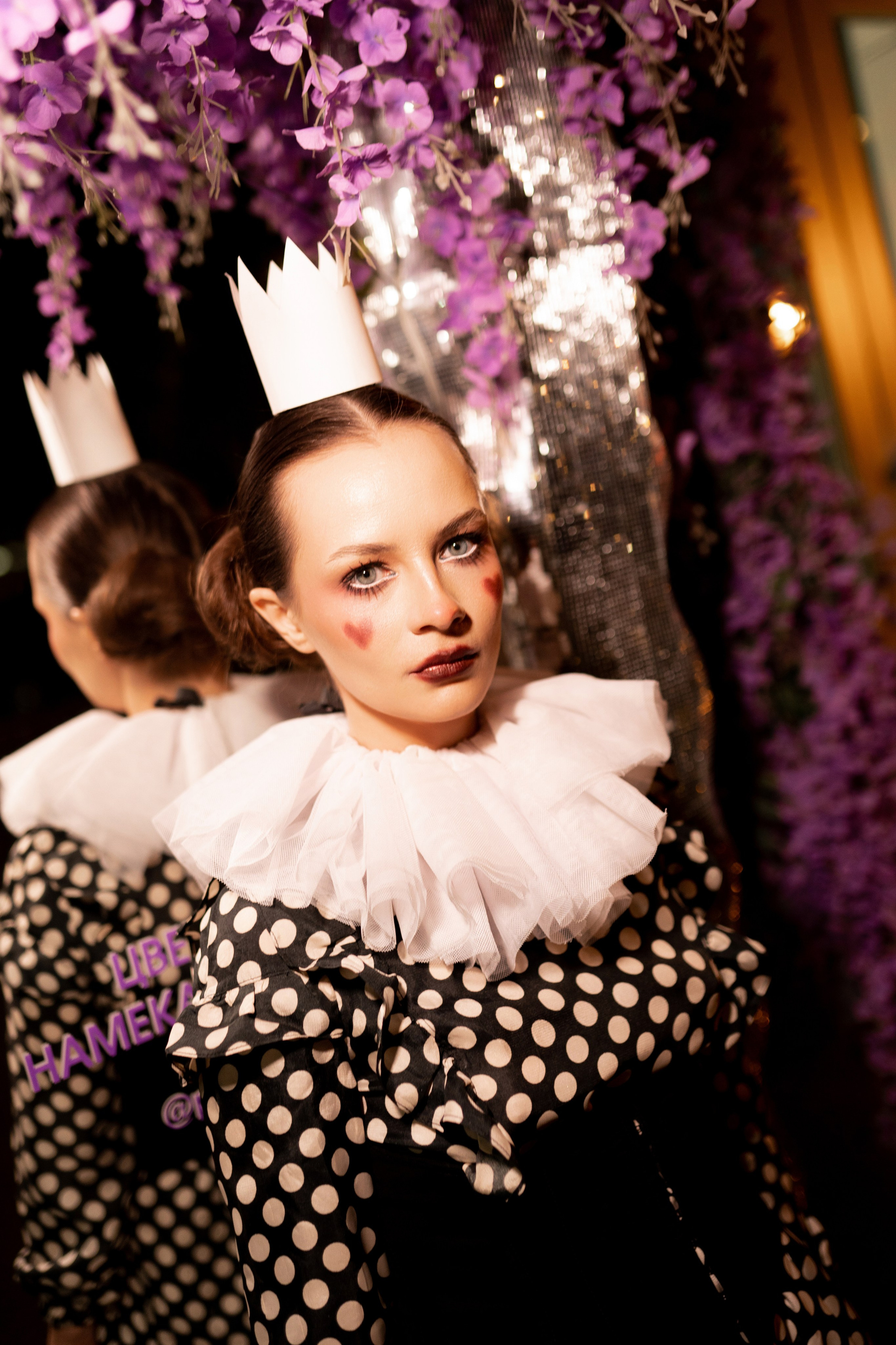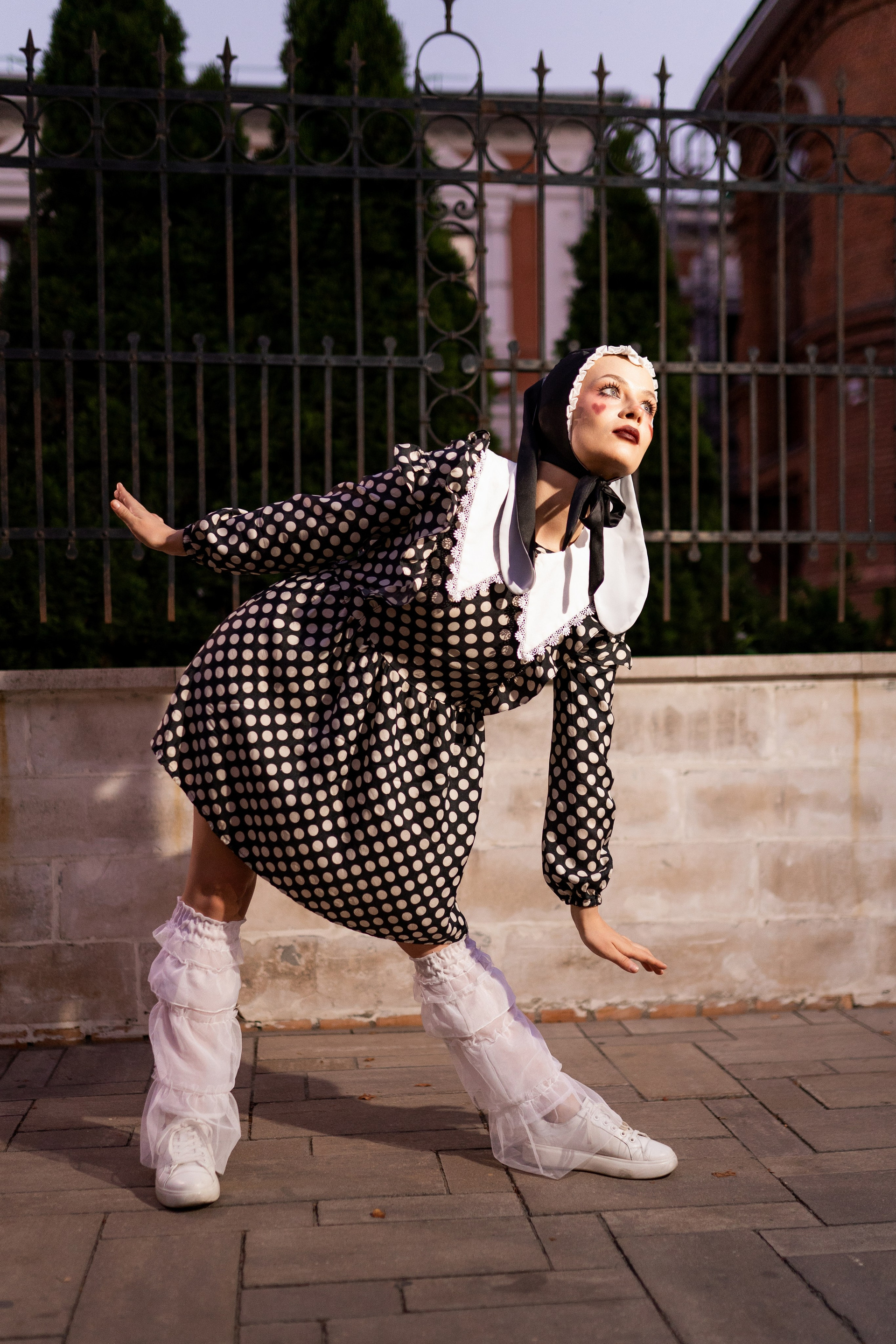 Игривое платье в белый горох становится основой трёх стилизаций: от казуального уличного образа до наивно-печального мима в капоре с заячьими ушками и шутовской версии с бумажной короной и широким воротником.
